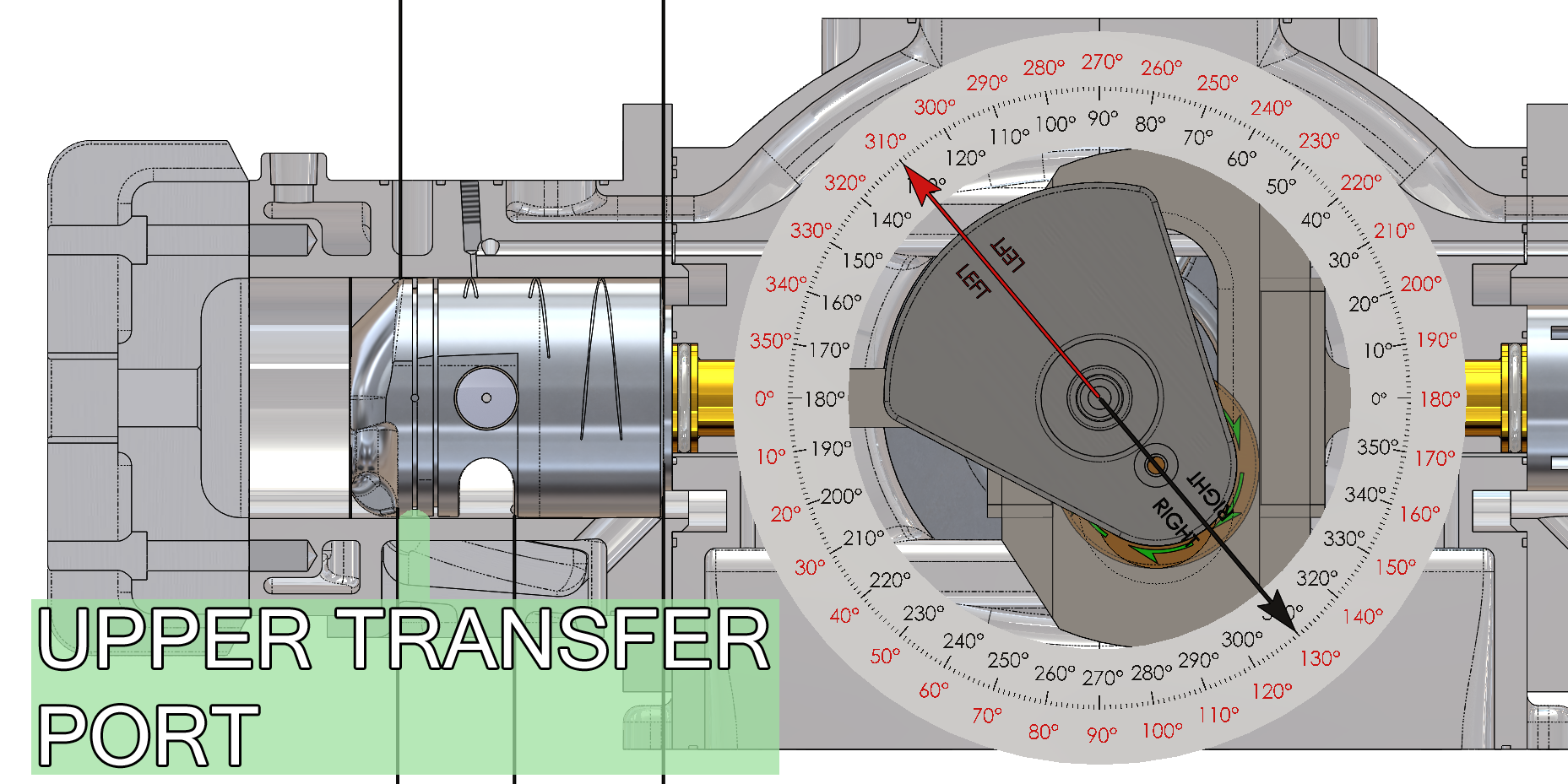- The upper transfer ports are open for 100 degrees of crankshaft travel (from 310 degrees before bottom dead center until 50 degrees after bottom dead center – red arrow and red degree compass on the animation).