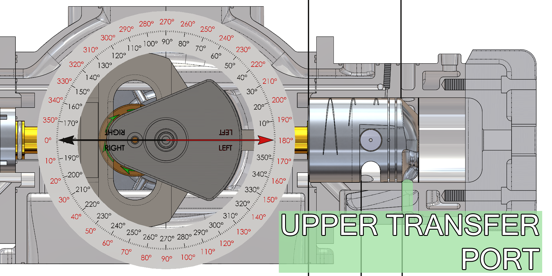 - The upper transfer ports are open for 100 degrees of crankshaft travel (from 130 degrees before bottom dead center until 230 degrees after bottom dead center – black arrow and black degree compass on the animation).